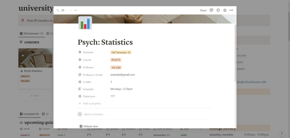Once you make this template your own, every detail you'll need will be a click away! Each class has its own special box where you can keep all of its information— professor's name and contact info, classroom #, syllabus, and more! Additionally, all of the sites you'll ever need for your college career can be linked on the righthand side of your page. Not to mention, your day-to-day tasks, weekly assignments, occasional papers, essays, and the unfortunate quizzes and exams can all be recorded with their respective due dates. With this template, you'll never be behind on your assignments!